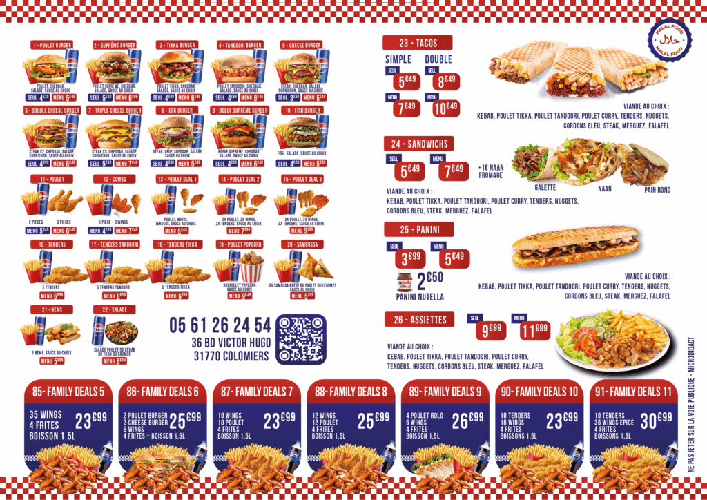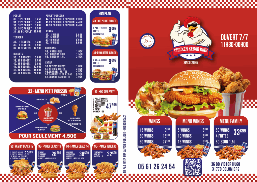 Bienvenue chez les Rois du Fast Food ! Ici, le poulet se décline sous toutes ses formes : croustillant, épicé, grillé… accompagné de burgers au goût unique et bien plus encore ! 🍔🍗